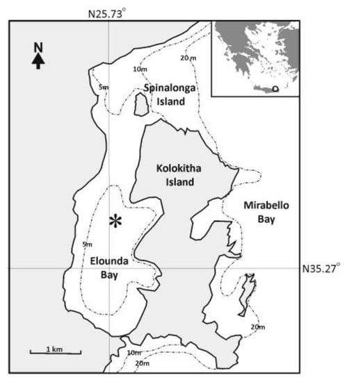 - Dounas, C. Environmental Study of Elounda Bay; HCMR Technical Report; Lasithi Prefecture: Crete, Greece, 2006; p. 316. (In Greek) [Google Scholar]