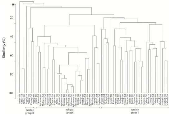 Similarity dendrogram based on the relative abundance of prey taxa matrix of the common fish species examined during the six sampling occasions in the study area.