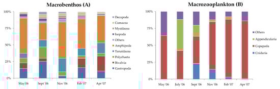 Relative abundance (% N) of the most important macrobenthic (A) and zooplanktonic (B) groups collected during the six sampling occasions in the study area.