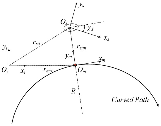 For curved path following, a kinematic controller generates the desired states for motion control. The control method can be designed using a dynamic model of the ship by specifying a reference frame that moves along the path. A Serret-Frenet reference frame [39] is usually chosen. Figure 4 shows an inertia reference frame , a body-fixed reference frame and a Serret-Frenet frame . The origin of is attached to the point on the path that is closest to the vehicle. R denotes the radius of the curved path.