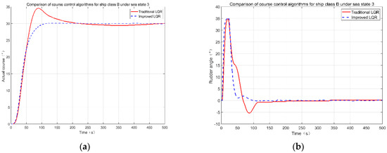 Comparative experiment of course control for ship class B: (a) The course angle changes with time; (b) The actual rudder angle changes with time.