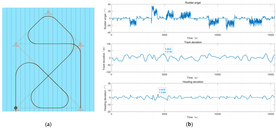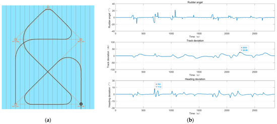 Testing results for ship class B: (a) Ship trajectory; (b) Observation index: rudder angle, track deviation and heading deviation.