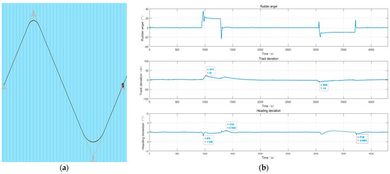 Testing results for ship class A: (a) Ship trajectory; (b) Observation index: rudder angle, track deviation and heading deviation.