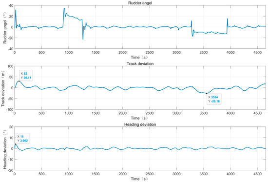 Testing results for ship class B in the presence of disturbance: rudder angle, track deviation and heading deviation.