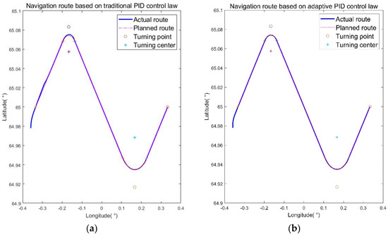 Navigation route for ship class B under different control methods: (a) traditional proportional-integral-derivative (PID) control law; (b) adaptive PID control law.
