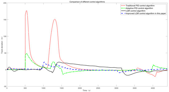 To further verify the control effect of the proposed algorithm, additional comparative experiments have been done. For ship class B, the traditional and adaptive PID control algorithms were used for track control, as shown in Figure 15. The experimental results are also compared with traditional LQR controller and the improved LQR control algorithm with nonlinear feedback term proposed in this paper and the track deviations are shown in Figure 16. Specific data are in Table 9. It can be seen from the experimental results that the traditional LQR control method has better tracking effect in the tracking task of direct sail or low speed tracking simple curve. However, it is difficult to guarantee the tracking accuracy in tracking complex task path. The maximum deviation under traditional PID controller, adaptive PID controller, traditional LQR controller and improved LQR controller are as follows: 176.9 m, 48.51 m, 23.32m and 22 m. In terms of stability, the traditional LQR controller performs poorly. And for the improved LQR controller, the deviation is around 0 for more than 3000 s. The performance of the control method proposed in this paper is significantly better than that of the other three control methods.