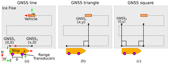 , marks the origin of the ice frame and was aligned with the stern of the ship, and 5 m off the port side. The position of the remaining GNSS units are depicted in