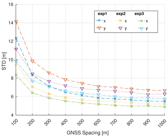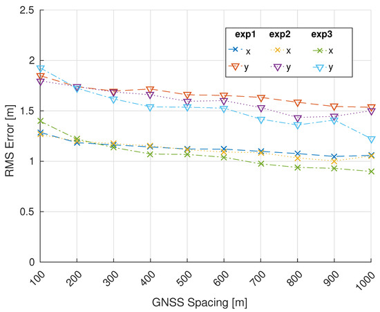 RMS position error for the 7.7 km simulated mission. For each GNSS configuration (line, triangle, square, corresponding to exp1, exp2, exp3 respectively), we note that increased sensor separation is correlated with decreased ice-relative vehicle RMS position error.