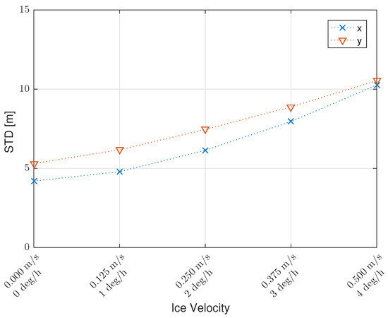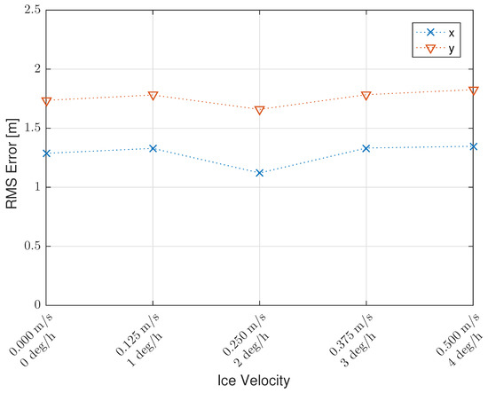 position RMS error, averaged over each simulated mission. Position RMS error appears to increase slightly with increasing ice velocity, with the exception of the 0.25 m/s, 2