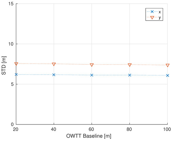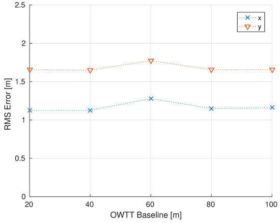 To examine the effect of OWTT transducer spacing, the simulated baseline was varied from 20–100 m. Previous deployments in the Arctic reported using a baseline of approximately 40 m [