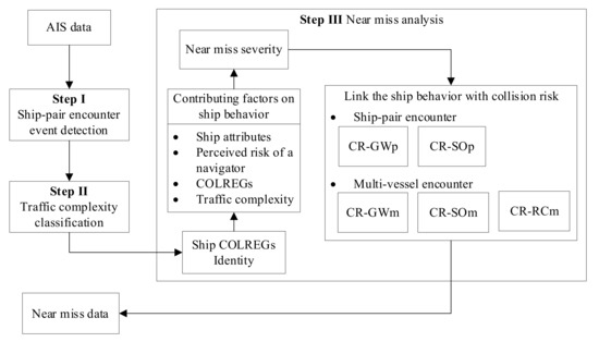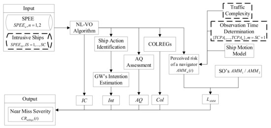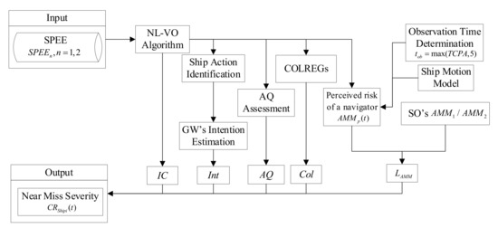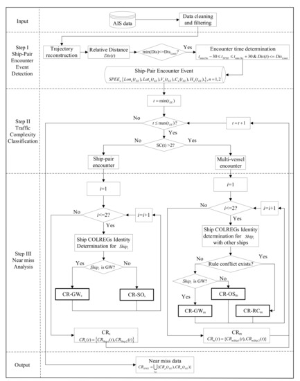 Finally, the collision risk of each ship of this ship pair () at every time step is analyzed. The designed algorithm of the near miss detection is elaborated in Figure 2. These collision risk analysis modules, including CR-GWp, CR-SOp, CR-GWm, CR-SOm, and CR-RCm, are elaborated in Section 2.3.