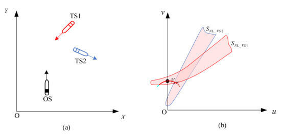 where is the union of the velocity obstacle zone of all the surrounding ships—see the area marked in red in Figure 5b. Compared with Formula (2), the near miss can be eliminated if this maneuver with the adopted rudder angle can move the current velocity () out the within . is the TCPA between the OS and all other surrounding ships. is the ship count of intrusive ships. Other symbols are the same as those in Formula (2).