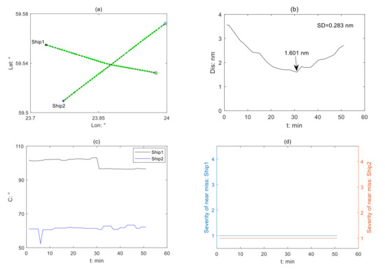Ship navigation information provided by automatic identification system (AIS) data is widely used for ship collision analysis [13]. Various methods have been proposed to analyze near misses from historical AIS data. Generally, there are two different ways to understand and detect a near miss: the first way is using the nearness to an accident, while the second way is using the evasive action [14]. The first way, using the nearness to an accident, is more widely used—see [15,16,17,18,19,20,21,22], etc. Through this method, water traffic risk can be quantified based on the count or frequency of near miss. For example, the hotspots where the occurrence frequency of near misses is high can be identified [23]. However, the dynamic nature of ship behavior is often ignored by simplifying the encounter process. The widely adopted assumption that a ship maintains its course and speed under the threat of collision has been criticized in previous research studies [24,25]. Therefore, considering the dynamic nature of ship behavior helps improve the accuracy of near miss detection.