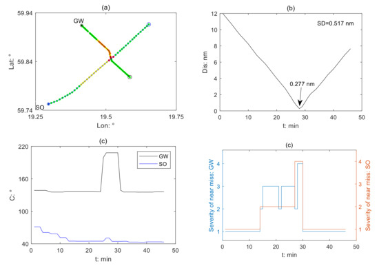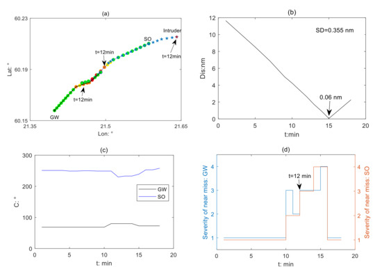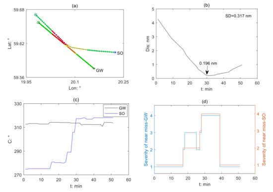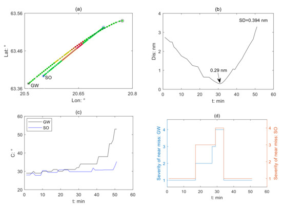 Four typical ship pair encounter scenarios were selected to illustrate how the near miss is detected and how the severity is determined—see Figure 10, Figure 11, Figure 12 and Figure 13. Each scenario contains four pictures to show the details of results. Figure 10a, Figure 11a, Figure 12a and Figure 13a present the ship trajectory and the result of near miss detection and its severity. Different colors mean different risk levels. From green, to yellow, orange, and red, the risk level increases from no risk to low risk, medium risk, and high risk. The color set is consistent with Table 1. The start point of a ship is marked as a star, and its endpoint is a circle. The ship COLREGs identity (GW or SO) was determined based on Section 2.3.1. The trajectories of the GW and SO are the black and blue lines, respectively. Figure 10b, Figure 11b, Figure 12b and Figure 13b regard their relative distance. Figure 10c, Figure 11c, Figure 12c and Figure 13c display the change in ship course. Figure 10d, Figure 11d, Figure 12d and Figure 13d show the severity of the detected near miss. The ship attributes are listed in Table 4. MMSI is Maritime Mobile Service Identity. The related information of these ship pairs for determining the ship COLREGs identity is listed in Table 5. The ship COLREGs identity is determined when the collision risk occurs. The collision risk occurs at . and are the relative bearing and relative heading of the ship pair seen from the perspective of the GW. and are the relative bearing and relative heading of the ship pair seen from the perspective of the SO.