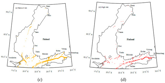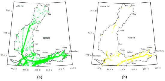In this section, the proposed method of near miss detection is applied to the Northern Baltic Sea, defined as the area north of 59°N. The AIS data were obtained from [46]. After data processing, including cleaning, filtering, and interpolation, the AIS data were applied to detect the possible near miss in the Northern Baltic Sea in Zhang et al. [12,19]. The promising results attest that the quality of this processed AIS data is acceptable. This processed AIS data are adopted in this work. Some results of the model application are shown in this section. Moreover, the model is evaluated using example encounter scenarios and spatial analysis of where encounters of different severity levels are found to occur.