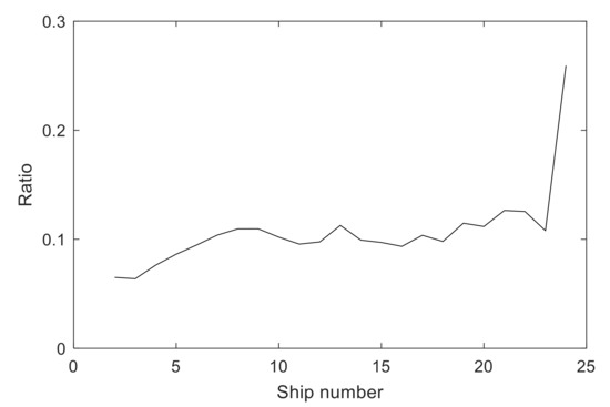 In this work, only the passenger ship, tanker, and cargo ship were considered. Specific-purpose ships, including the tug, pilot vessel, wing in the ground, high-speed craft, and dredgers, were excluded due to their unknown working states, as their behaviors in working and non-working states are different [47]. The AIS data of July 2011 in the Northern Baltic Sea were used. There were 1638 ships in total, where around 61.8% of them are cargo ships (1012), 16% are passenger ships (262), and 22.2% are tankers (364).