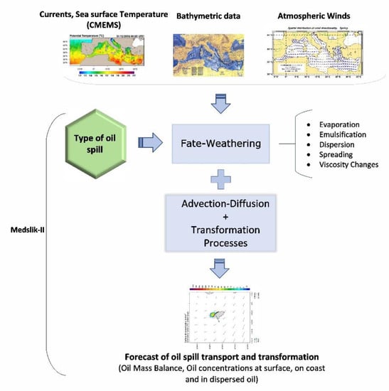 - Zodiatis, G.; De Dominicis, M.; Perivoliotis, L.; Radhakrishnan, H.; Georgoudis, E.; Sotillo, M.; Lardner, R.; Krokos, G.; Bruciaferri, D.; Clementi, E. The Mediterranean decision support system for marine safety dedicated to oil slicks predictions. Deep Sea Res. Part II Top. Stud. Oceanogr. 2016, 133, 4–20. [Google Scholar] [CrossRef]