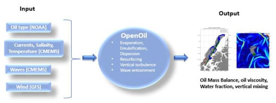 Overall, there are various models in literature aiming to predict the trajectory and fate of hydrocarbon spills occurring at the sea surface and the water column. The main inputs in each case are not only oil spill data, such as the type of oil and the initial location of spillage, but also metocean variables, such as the three-dimensional flow field, sea temperature, salinity and density profiles, atmospheric winds, and bathymetry. These latter data may be obtained from different operational oceanographic forecasting systems, such as CMEMS (Copernicus Marine Environmental Monitoring Service, http://marine.copernicus.eu/ []) and NOAA (National Oceanic and Atmospheric Administration). Furthermore, advanced oil spill models have the capacity to use satellite synthetic aperture radar (SAR) imagery to detect oil spills [,,]. Generally, to run an oil spill model, the following data are required as a minimum: (a) oil spill scenario details, (b) oil properties, (c) metocean data, and (d) output requirements.