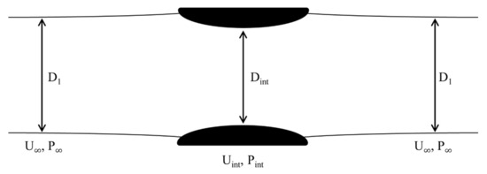Furthermore, the one-dimensional mass-conservation formula was utilised to acquire the width of the fluid streamtube at a far upstream location in relation to the Reynolds number. The radius coefficient increased proportionally, as illustrated in Figure 6, establishing a larger mass–flow passing through the duct from an upstream position. In accordance with the increase due to the Bernoulli effect, however, it is unattainable for the upstream width () to surpass the external duct width (). Therefore, when considering an open-ended, cylindrical, bi-directional duct, the maximum axial velocity coefficient potentially attained is equivalent to the duct external–internal areal ratio ().