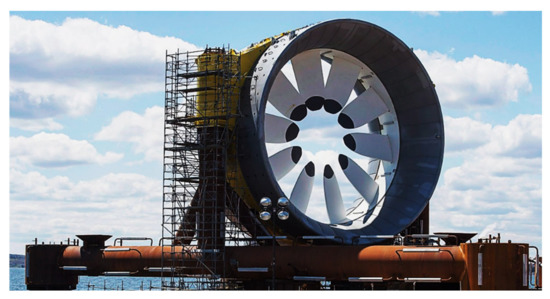Attributable to the potential increase in power extraction as a result of mass–flow increase through a rotor, several commercial endeavours had attempted to adopt ducted turbine technology to achieve economic prospects. Amongst the ventures, DCNS/OpenHydro Ltd. had designed an open-centre ducted design approach [6,7]. In open-water trials, a 2 MW turbine was successfully installed in the Bay of Fundy, Canada, portrayed in Figure 2, together with a pair of 500 kW rated capacity turbines in Paimpol-Bréhat, Northern France, in collaboration with EDF France.