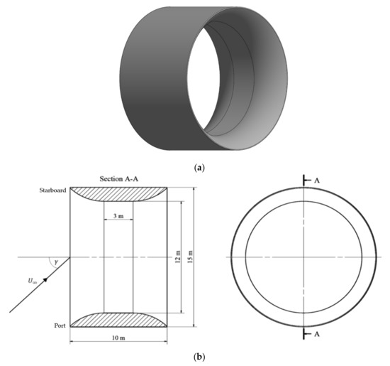 The dimensions of the cylindrical bi-directional duct describe an external duct diameter () of 15 m, an internal duct diameter () of 12 m, with a flat-convex cross-sectional profile, and a duct length () of 10 m, as illustrated in Figure 3a,b. The flow parameters were considered from site analyses that had established a maximum acquired spring tide velocity of 4.0 m.s−1, and a surface velocity of 5.0 m.s−1 [23,24]. In recognition of the literature, free-stream velocity () magnitudes of 1.0, 2.5, 4.0, 5.5, and 7.0 m.s−1 were analysed to establish a variation between low and extreme current conditions. Additionally, the tidal cycle at the Paimpol–Bréhat site had been numerically simulated [25,26]. An asymmetric velocity was acknowledged in both magnitude and direction, at ebb and flood, with an average-depth angular discrepancy of 20°. Therefore, yaw bearing () angles of 0°, 7°, 15°, 23.2°, 27°, 30°, 38°, and 45°, incoming from the turbine port direction at a magnitude of 4 m.s−1, were investigated to establish the duct swallowing capacity under non-aligned flow conditions. The considered conditions are summarised in Table 1 and Table 2. The simulations implemented an inlet turbulence intensity of 3% and an inlet turbulent length scale of 1 m.