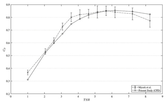 Drag coefficient () in relation to tip–speed ratio (TSR) for validation of the CFD model by comparing a numerical tidal turbine model [21] to experimentation [29].