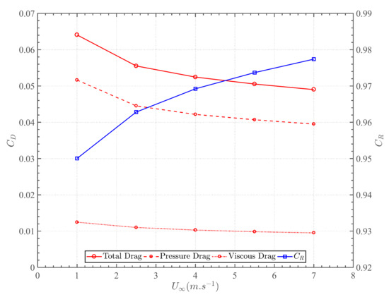 Analysing the vacant duct, the drag coefficient decreased from a value of 0.0641 to 0.0490 with a Reynolds number increase from 1.494 107 to 1.046 108, as illustrated in Figure 6. A laminar boundary layer transitions to a turbulent boundary layer earlier with an increase in Reynolds number, thereby enhancing flow attachment and diminishing drag. This phenomenon was acknowledged to be the driving factor behind the reduction in drag with an increase in free-stream velocity. The value of drag was minute due to the throat orifice constituting 64% of the frontal area. Distinguishing the total drag in its pressure and viscous components, both drag components reduced with an increase in Reynolds number, yet the pressure drag diminished more substantially in magnitude.
