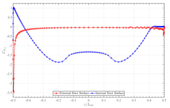 To establish the angular flow-stream effects upon the wall static pressure induced along the duct surfaces, the distribution along the duct cross-section was analysed as depicted in Figure 14. The surfaces were discretised by their internal and external positions, in starboard and port directions. Furthermore, the static pressure within the domain cross-section is illustrated in Figure 15.