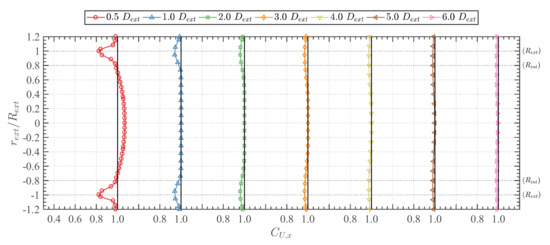 Axial velocity coefficient () profiles within the duct wake at different downstream displacements ( 4 m.s−1; 0°).