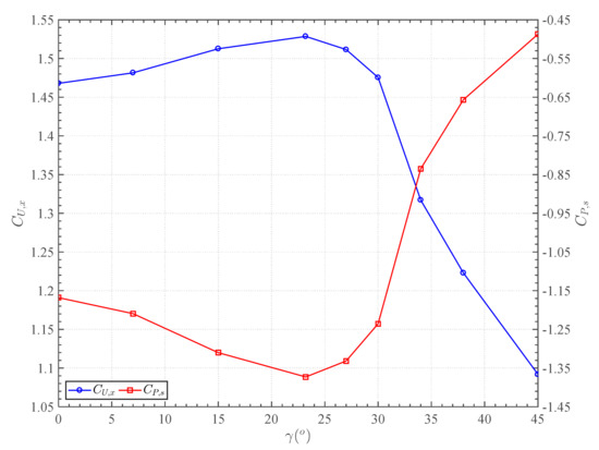 In accordance with the discrepancy in drag and lift, the variation in normalised axial velocity and static pressure within the duct throat was established, as illustrated in Figure 11. The velocity coefficient increased from a value of 1.47 to 1.53 at bearings from 0° to 23.2°. The coefficient then decreased from 1.53 to 1.09 at bearings from 23.2° to 45°. The static pressure coefficient decreased from −1.17 to −1.37 at bearings from 0° to 23.2°, and increased from −1.37 to −0.49 at bearings from 23.2° to 45°.