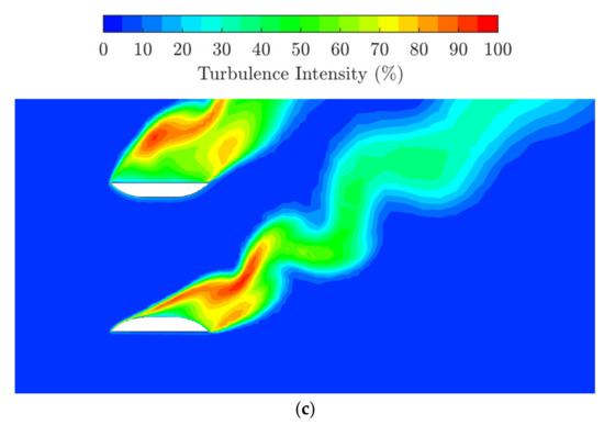 Illustrative cross-sectional representation of the turbulence intensity within the duct domain at distinct yaw angles ( 4 m.s−1). (a) 0°; (b) 23.2°; (c) 38°.