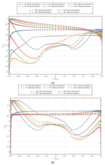 Evaluations of static pressure coefficient () distribution along the duct surfaces at 0°, 15°, 23.2°, 30°, 38°. (a) Static pressure coefficient along the duct surfaces at port-side; (b) Static pressure coefficient along the duct surfaces at starboard-side.