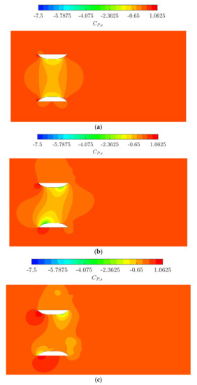 Illustrative cross-sectional representation of the pressure coefficient () within the duct domain at distinct yaw angles ( 4 m.s−1). (a) 0°; (b) 23.2°; (c) 38°.