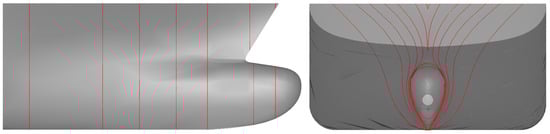 In this work, we make combined use of two general purpose shape parameterization algorithms to deform the three dimensional geometry of a ship hull, and accordingly update the volumetric grid used for ship hydrodynamics simulations in a fully automated fashion. More specifically, free form deformation (FFD) is first used to generate a family of deformations of the surface of a base hull. In a second step, radial basis functions (RBF) interpolation is used to propagate the hull surface deformation to the internal nodes of the fluid dynamic simulation computational grid. For visual reference, Figure 2 depicts the side view (on the left) and front view (on the right) of a container ship hull bow region. In the picture, several sections perpendicular to the hull longitudinal axis are indicated by red lines.