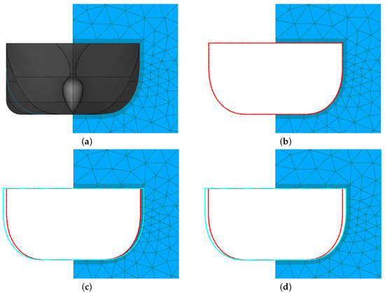 Both the FFD and RBF algorithms briefly described in this section have been implemented in the Python library for geometrical morphing PyGeM [17], which has been used to produce all the deformed geometries and computational grids used in this work. An example of the RBF application to volumetric mesh morphing described in this paragraph is presented in Figure 4. The figure illustrates all the steps involved in the procedure, which starts with (a) a first volumetric mesh around the hull, and (b) a surface mesh on the hull surface. In step (c) the latter mesh is then deformed and (d) the surface mesh displacement field is finally used to feed the RBF algorithm and propagate the boundary motion to the internal volumetric mesh nodes. As it can be appreciated in the illustration, to avoid distortion of the volumetric mesh symmetry plane, the surface mesh must include both sides of the hull. In the present work, the deformation of the surface mesh has been carried out by means of FFD. Yet, we remark that any deformation law which results in a one to one correspondence between original and deformed surface grids can be propagated to the nodes of the volumetric mesh with RBF interpolation.
