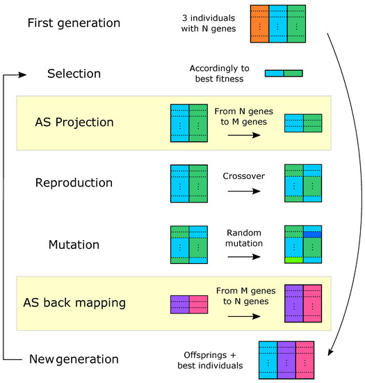Active subspaces-based genetic algorithm scheme. The main step of the classical genetic algorithm (GA) are depicted from top to bottom. The yellow boxes represent projections onto and from lower dimension active subspace. Thus, they are specific to ASGA.