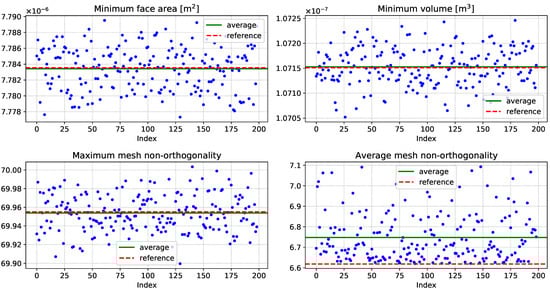 Values of the main mesh quality indicators as reported by checkMesh utility of OpenFOAM library, as a function of the index corresponding to each of the 200 volumetric meshes produced for the simulation campaign.
