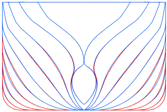 Visual examples of hull deformation with (on left) and (on right). The red surface refers to the deformed ships, while the blue one is the original hull.