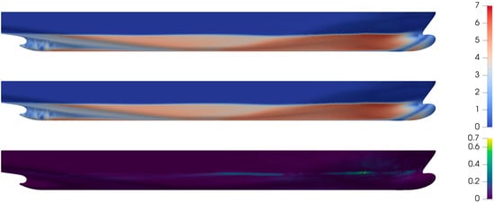 We remark that the POD-GPR model approximates the distribution of the output of interest, not the objective function—which is computed using the predicted fields. For this reason, we can also compare the pressure and shear stresses over the optimal hull with respect to the undeformed one. Figure 11 and Figure 13 present the graphical investigations about the ROM approximation error distribution over the undeformed hull, both for pressure and stresses distributions. For a more realistic comparison, we specify that the FOM snapshots referring to the undeformed geometry has been removed from the database, emulating the approximation any untested parameter. We proceed in the same way also for the optimal shape (Figure 12 and Figure 14), not only to measure the accuracy of the POD-GPR model, but also for investigating the reasons of the reduction from a physical perspective. The absolute error is quite small, but it is possible to note that for both the fields it is mainly concentrated along the free-surface.