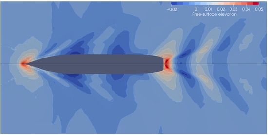 The FOM used in this work is the Reynolds Averaged Navies–Stokes (RANS) model complemented by a Volume of Fluid (VOF) front capturing method to deal with the multi phase nature of the fluid surrounding the hull. The resulting govern equations are discretized by means of a Finite Volumes (FV) strategy implemented in the open source library openFOAM [25]. Such mathematical and numerical setup is nowadays adopted in many industrial naval contexts thanks to its robustness and accuracy. The test case considered is one of the tutorials of the library, which is designed to reproduce the DTC experiments reported in reference [21]. We here provide a minimal overall description of the model. We refer to the original documentation of the library for all the numerical and technical details.