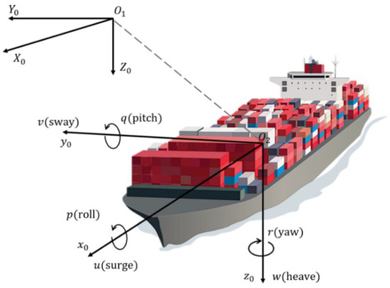 The essence of the parametric gray-box modeling is to construct a simplified parameterized equation to replace Equation (1). Figure 2 shows the 6 DOF reference frames for the ship. The nondimensional rigid-body kinetics using the Prime system of surface ship 3 DOF maneuvering motion is given as follows:
