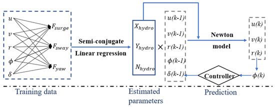 The traditional way to fit the hydrodynamic force in gray-box model is to expand it into a linear function of velocity. For ship modeling, different parametric model structures, such as Abkowtiz model [9,10], Maneuvering Model-ing Group (MMG) model [11] and Nomoto model [12], have been proposed and validated over the years. The hydrodynamic parameters can be obtained by a captive model test with planar motion mechanism (PMM), computational fluid dynamics (CFD) and free-running tests with system identification [13]. Among the above approaches, the system identification with free-running test has been proven to be a powerful and practical method with lower experiment cost [14]. System identification is a general term for estimating parameters from observed input and output data, which provides a reliable mathematical surrogate model in multiple engineering areas [15]. The least square (LS) [16], extended Kalman filter (EKF) [17] and maximum likelihood (ML) [18] algorithms are introduced to identify the hydrodynamic derivatives and proved the effectiveness. Over the last decade, some new methods, with stronger generalization ability and robustness, based on machine learning have also been applied to the estimation of hydrodynamic parameters. Minimizing the Hausdorff metric with the genetic algorithm (GA) can alleviate the impact of noise-induced problems [14]. Mei et al. [19] introduced model reference and random forest (RM-RF) to model ship dynamic model and validated the proposed scheme with free-running test data. Wang et al. [20] presented nu-Support Vector Machine (v-SVM) to improve the robustness of the algorithm.