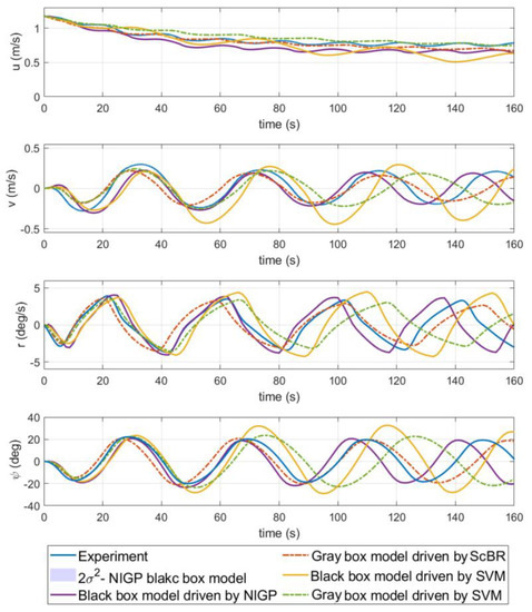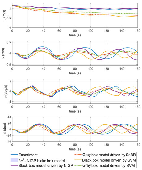 Here, 35°/5° and 20°/5° zigzag maneuvers every 5 s are used for training the black-box modeling driven by NIGP and SVM. It is of no application value to predict the training movement of ship by using the model obtained from the training data. To verify the generalization ability of the models identified by gray-box modeling and black-box modeling driven by SVM and Bayesian regression, the 30°/5° and 15°/5° zigzag tests are predicted. Figure 5 and Figure 6 show the prediction results of each method, and the root mean square error (RMSE) is adopted to analyze the prediction performance of these methods, which is shown in Table 4. In addition, the computation time of each step of these methods for prediction is also listed in the table. From the validation results, it can be concluded that the trends of all the predictions before 70 s are basically consistent with the experiment. After 70 s, the difference between the predictions results of various methods gradually increased. On the whole, the parametric gray-box and black-box modeling based on Bayesian regression results are in acceptable agreement with the validation samples and show a stronger ability to predict than SVM. From the perspective of the modeling framework, the prediction results of gray-box modeling are better than those of black-box modeling in 30°/5° zigzag maneuvers, but worse in 15°/5° zigzag tests. The main reason is that the training data of gray-box modeling only contain 35°/5° movement, which is closer to the 30°/5° zigzag validation test. For the prediction time, parametric gray-box modeling is significantly faster than black-box modeling because the calculation process of parametric gray-box modeling is entirely linear. Because it considers the input noise and variance in the calculation process, NIGP spends more time on the prediction than SVM. Note that the black-box modeling usually requires more training data to enhance generalization ability than parametric gray-box modeling, because the specified framework of the parametric gray-box model already contains some information about the system. In a similar study [28], four groups of ship maneuver datasets are used for training black-box models while one group dataset is used for parameter estimation.