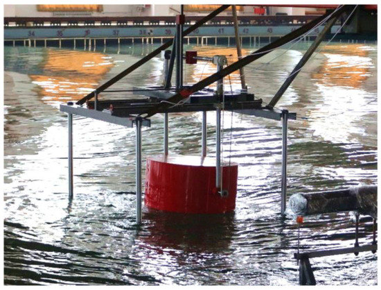 The experiment was carried out in the wave tank of Ocean University of China [60], as shown in Figure 9. The model had three independent DOF: surge, heave and pitch. The main dimensions and parameters of the model are listed in Table 5. The NDI Optotrak Certus 3D investigator was used to collect the buy’s motion data. The mass of the sliding frame was 58 kg. A spring was used to provide the restoring force for the motion of surge.