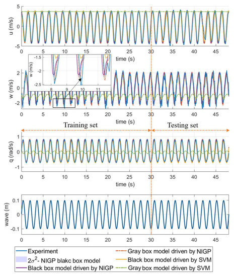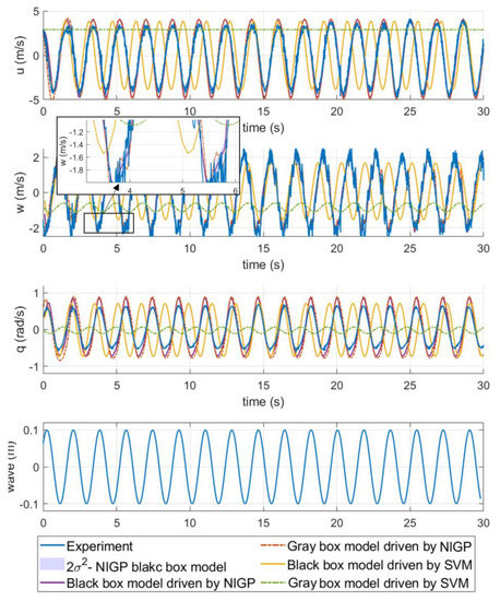 The wave period of the experimental data is 1.6 s. The first 30 s of the experimental data were used to train each model, and the last 15 s of the data were used as the test set to verify the accuracy of the identified models. The sampling interval of training data for nonparametric gray-box modeling is 0.05 s, while the black-box modeling is 0.1 s. Figure 10 shows that, except for the nonparametric gray-box model driven by SVM, the predicted results of the other three methods are almost the same as the experimental values. The rest motion data with a wave period of 1.8 s were used to further verify the identified models, as presented in Figure 11. It should be noted that the WEC buoy has different added mass in a different wave frequency, so we recalculated the added mass with the wave period 1.8 s and substituted it into Equation (31) for gray-box modeling prediction. Figure 11 shows that the trend of the experimental and Bayesian gray-box and black-box modeling prediction fit well in the motion of surge and heave. However, it can be observed that there is some discrepancy between the prediction and the experiment in pitch. This may be mainly due to fact that the frequency of wave in the training data is higher than that of the test, and the motion is very regular, which means that the training data do not fully reflect the dynamic characteristics of the device. In the 1.8 s wave period, the prediction of the gray-box modeling based on SVM failed, and its motion state was significantly slower than the experiment. The RMSE of u, w and q and computation time of the models are listed in Table 6. Table 6 demonstrates that the black-box model based on NIGP is the most accurate identification method for WEC buoy.