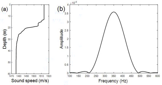 (a) Sound speed profile (SSP); (b) broadband acoustic source frequency spectrum.