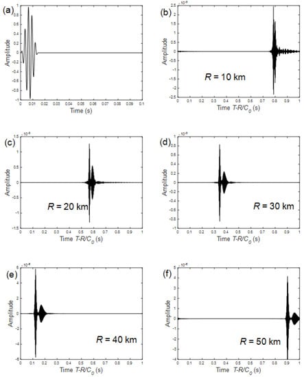 (a) Broadband acoustic source pulse; the received temporal pulse sequence at (b) 10, (c) 20, (d) 30, (e) 40 and (f) 50 km, where R represents the distance between the acoustic source and receiver (the same below).
