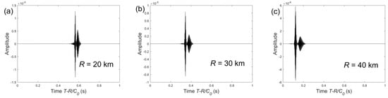 Received temporal signals at (a) 20, (b) 30 and (c) 40 km when only the first two main wave packets in Figure 2c–e remain.