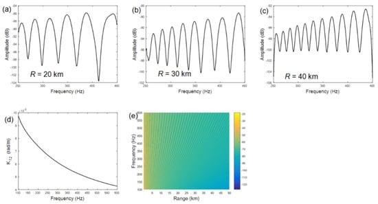 Frequency domain received signals for various R are shown in Figure 4a–c, and the interference pattern of the broadband acoustic pressure field containing all normal modes is shown in Figure 4e. The 250–450 Hz band is chosen because the source amplitude of the band is much larger and more flat than that of other bands, resulting in high ASL accuracy. This is a limitation of the proposed algorithm: the received signal spectrum is required to be relatively flat throughout the band. If not, you need to choose a relatively flat band from the broadband source spectrum, such as the 250:1:450 Hz band in Figure 1b.