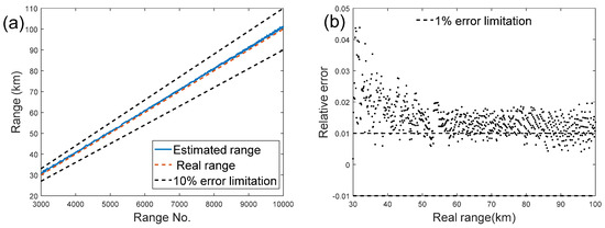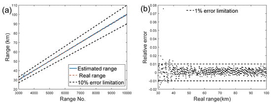 As shown in Figure 5a, at all R, the relative ranging error is far less than 10%. To further show the high precision of the ASR algorithm, we reduced the error limitation to 1%, and the relative ranging error with R is shown in Figure 5b, where the error is less than 1% at most distances and between 1 and 2% at a small part of distances, and higher than 2% and lower than 10% for only one measured point. Moreover, when R is further than 40 km, the error of all distances is within 1%, illustrating the high accuracy of the proposed method on far-field ASR.